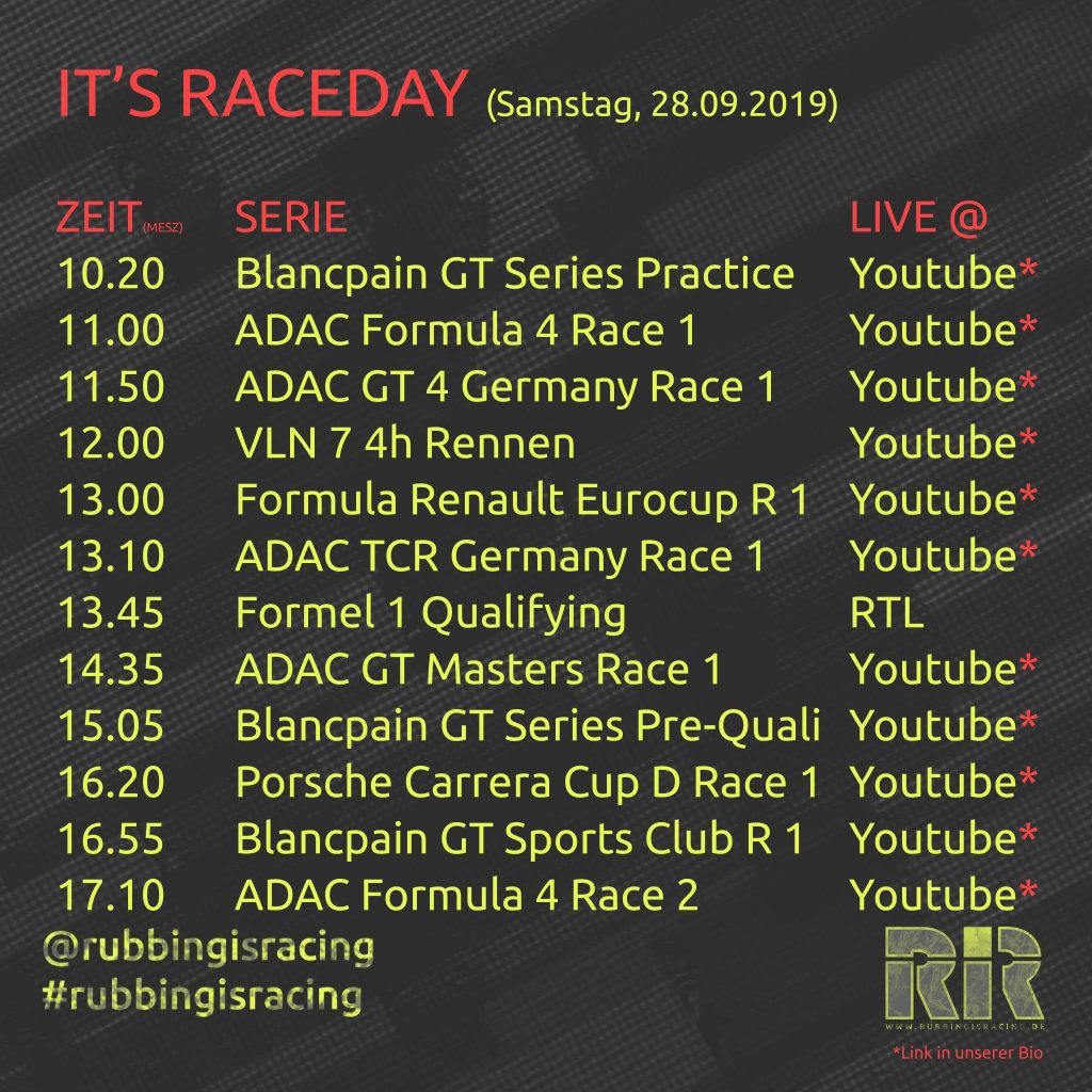 Samstag, 28.09.2019 – IT’S RACEDAY! Wir starten in ein neues Wochenende und das heißt „IT’S RACEDAY“!!! Wir haben für euch wieder die wichtigsten Links des Tages zusammengetragen. So erwarten euch heute u.a. die Formel 1 in Sotchi, die ADAC GT Masters vom Sachsenring sowie die Blancpain GT aus Barcelona. Natürlich sind alle Livestreams kostenlos! Viel Spaß beim Streamen!