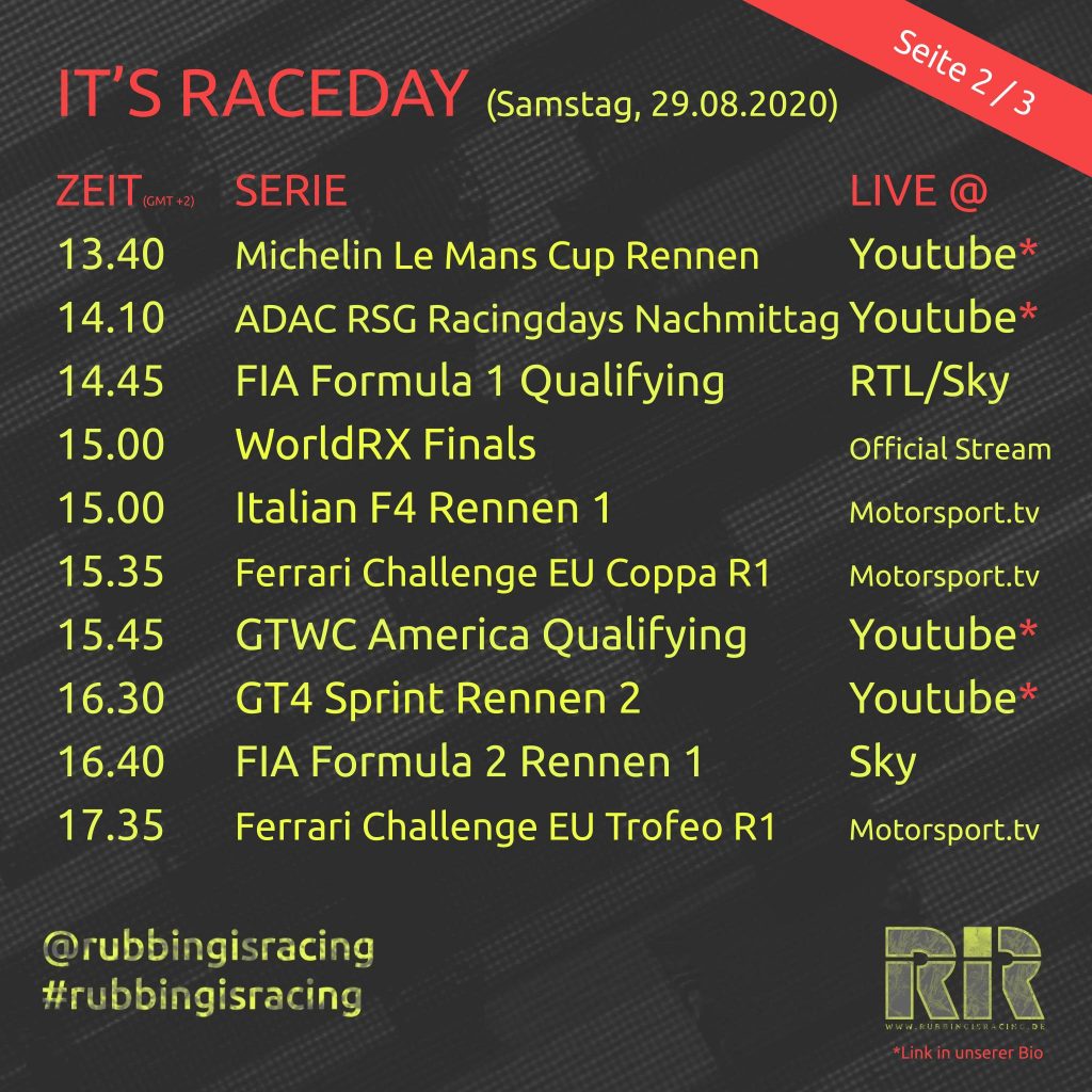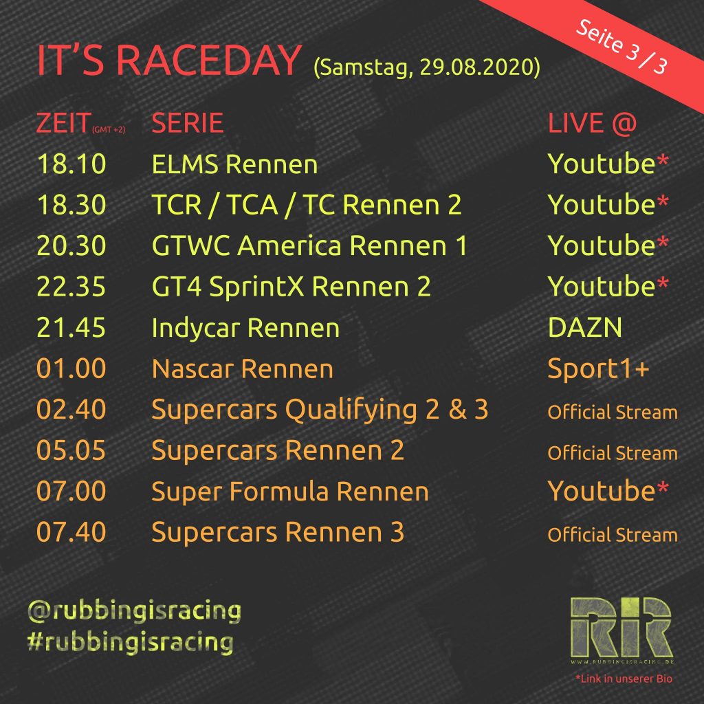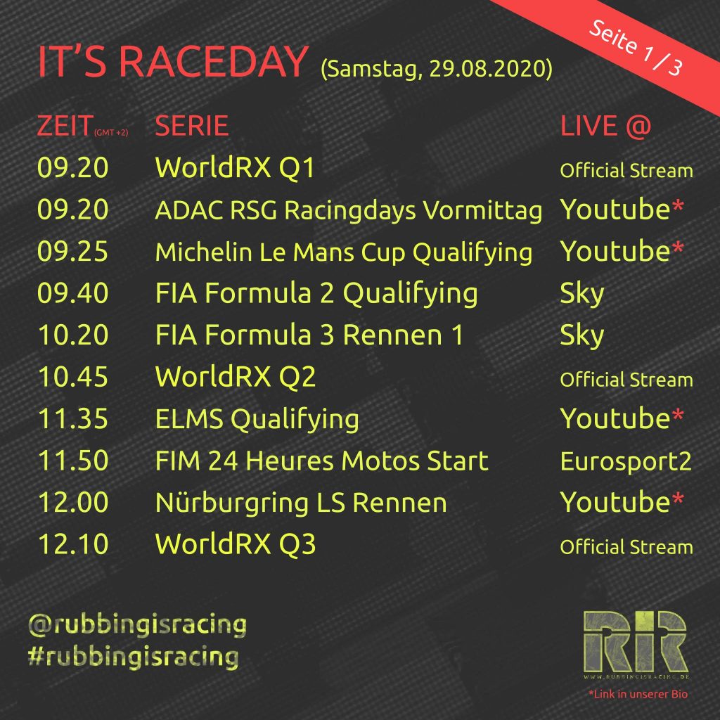 Samstag, 29.08.2020 – IT’S RACEDAY! Weiter geht das Vollgasjahr 2020. Die zweite Station der World RX in Finnland, die Formel 1 in Spa, sowie die nächste Runde der ELMS und den NLS. Für Motorradfans starten heute die FIM 24 Heurres Motos in Le Mans. Heute Nacht gibt es dann wieder Nascar, Indycar und die Supercars. Wie immer sind alle Livestreams kostenlos! Viel Spaß beim Streamen!