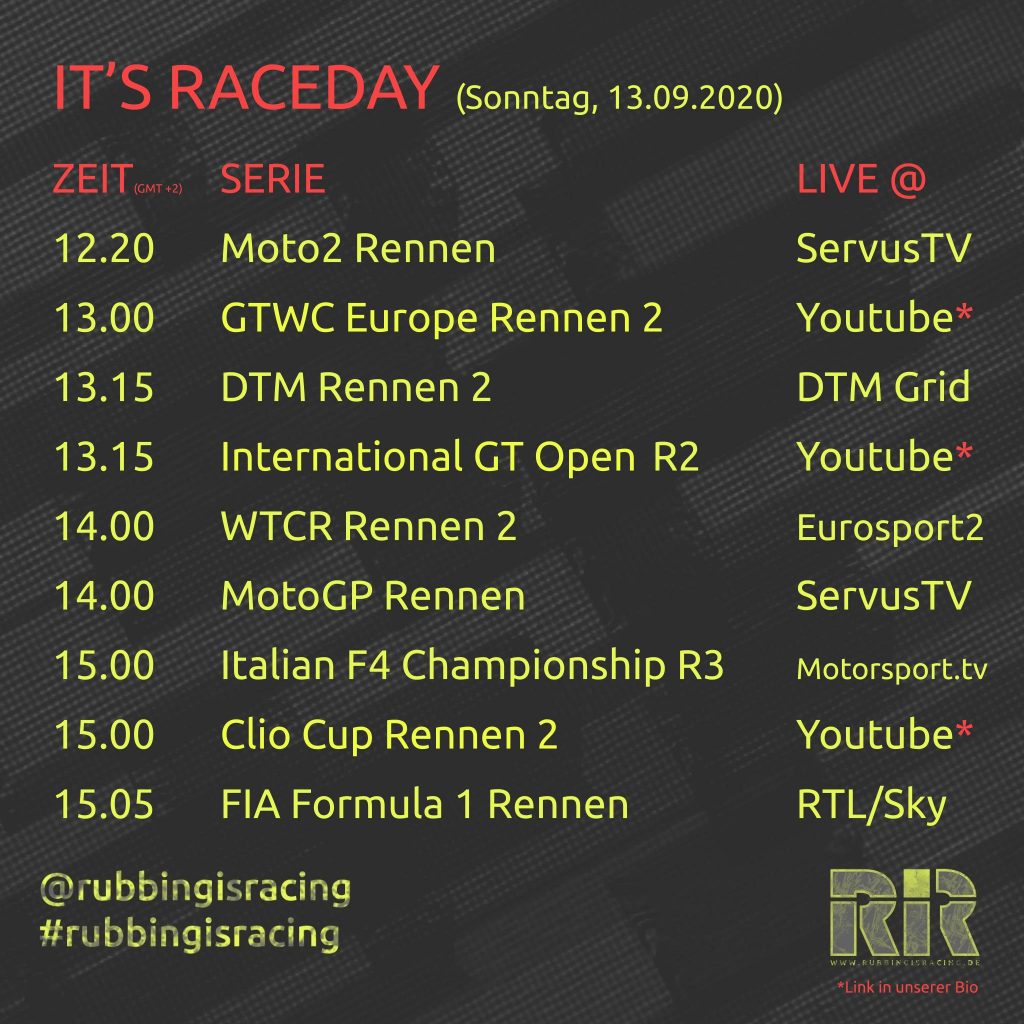 Sonntag, 13.09.2020 – IT’S RACEDAY! Teil zwei des Rennwochenendes. Es erwarten euch u.a. DTM und GTC am Nürburgring, International GT Open und Euroformula am RedBull Ring, die MotoGP in Misano, die GT World Challenge Europe in Magny Cours, die WTCR in Zolder und natürlich die Formel 1 in Mugello. Wie immer sind alle Livestreams kostenlos! Viel Spaß beim Streamen!