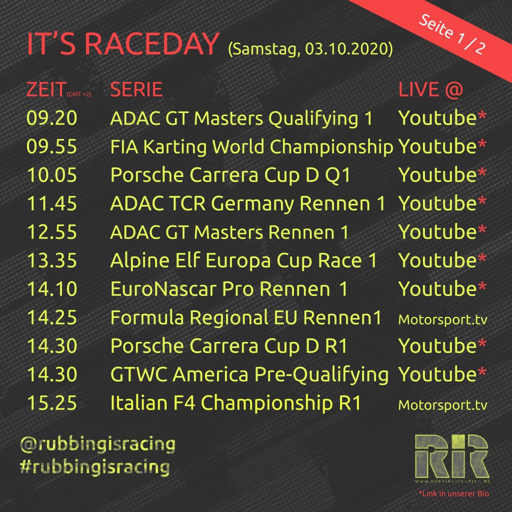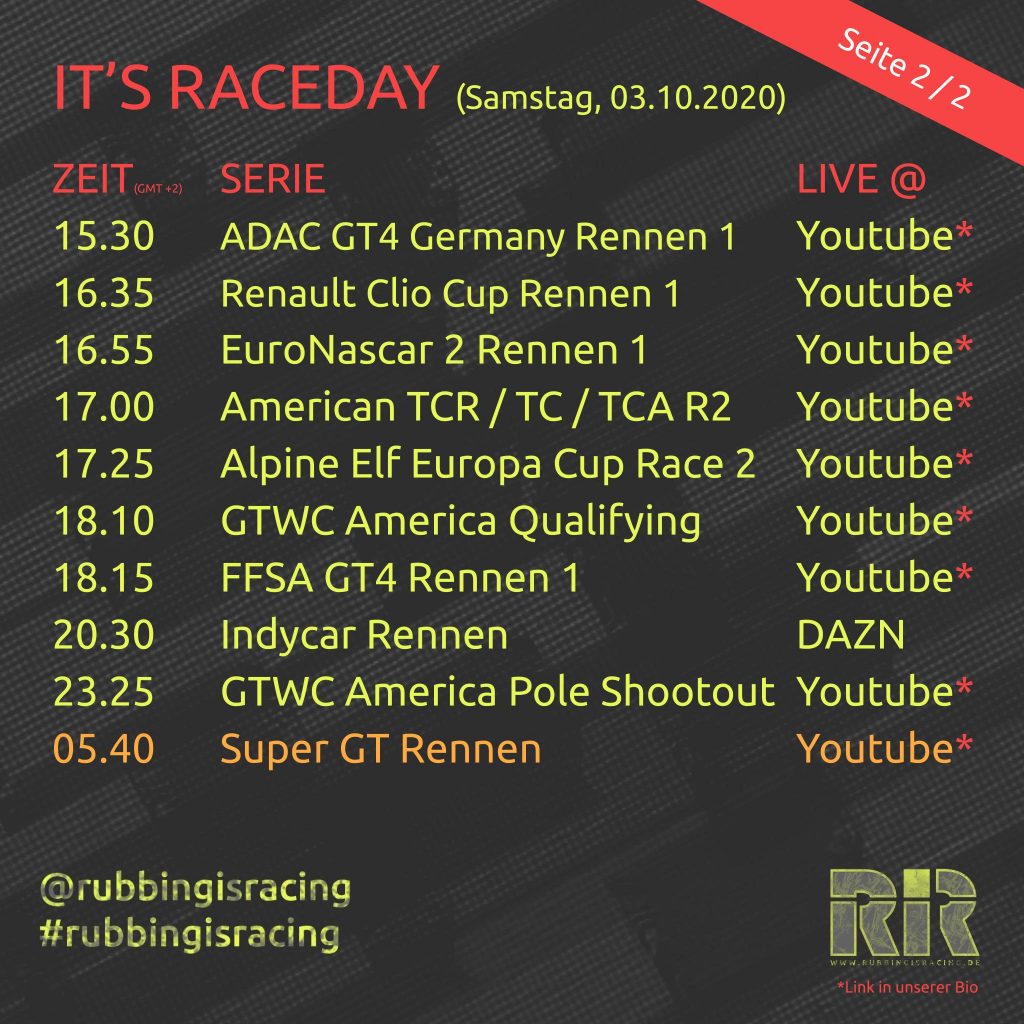 Samstag, 03.10.2020 – IT’S RACEDAY! Endlich mal wieder eine Runde der Intercontinental GT Challenge mit den 8h von Indianapolis. Hier gibt es heute alle Qualifying-Sessions live. Des Weiteren warten auf euch das Rennwochenende der ADAC GT Mastern am Sachsenring. Im Rahmenprogramm gibt es wie gewohnt die ADAC TCR Germany, die ADAC GT4 Germany sowie diesmal auch den Porsche Carrera Cup Deutschland. Sonst gibt es heute u.a. noch die Nascar Europe Series, Formel 4 aus Italien oder den Renault Clio Cup. Wie immer sind alle Livestreams kostenlos! Viel Spaß beim Streamen!