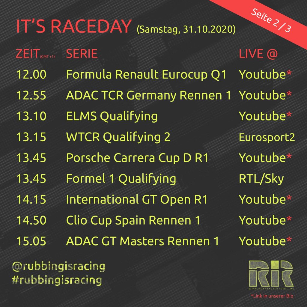 Samstag, 31.10.2020 – IT’S RACEDAY #96! Weiter geht es, mit dem nächsten prall gefüllten Rennwochenende! Diesmal gibt es neben der Formel 1 in Imola noch die ADAC GT Masters am Lausitzring, ELMS und Le Mans Cup aus Portimao, die International GT Open aus Barcelona, die FIA WTCR aus dem Motorland Aragon sowie die bekannten spannenden Rahmenserien. Wie immer sind alle Livestreams kostenlos! Viel Spaß beim Streamen!