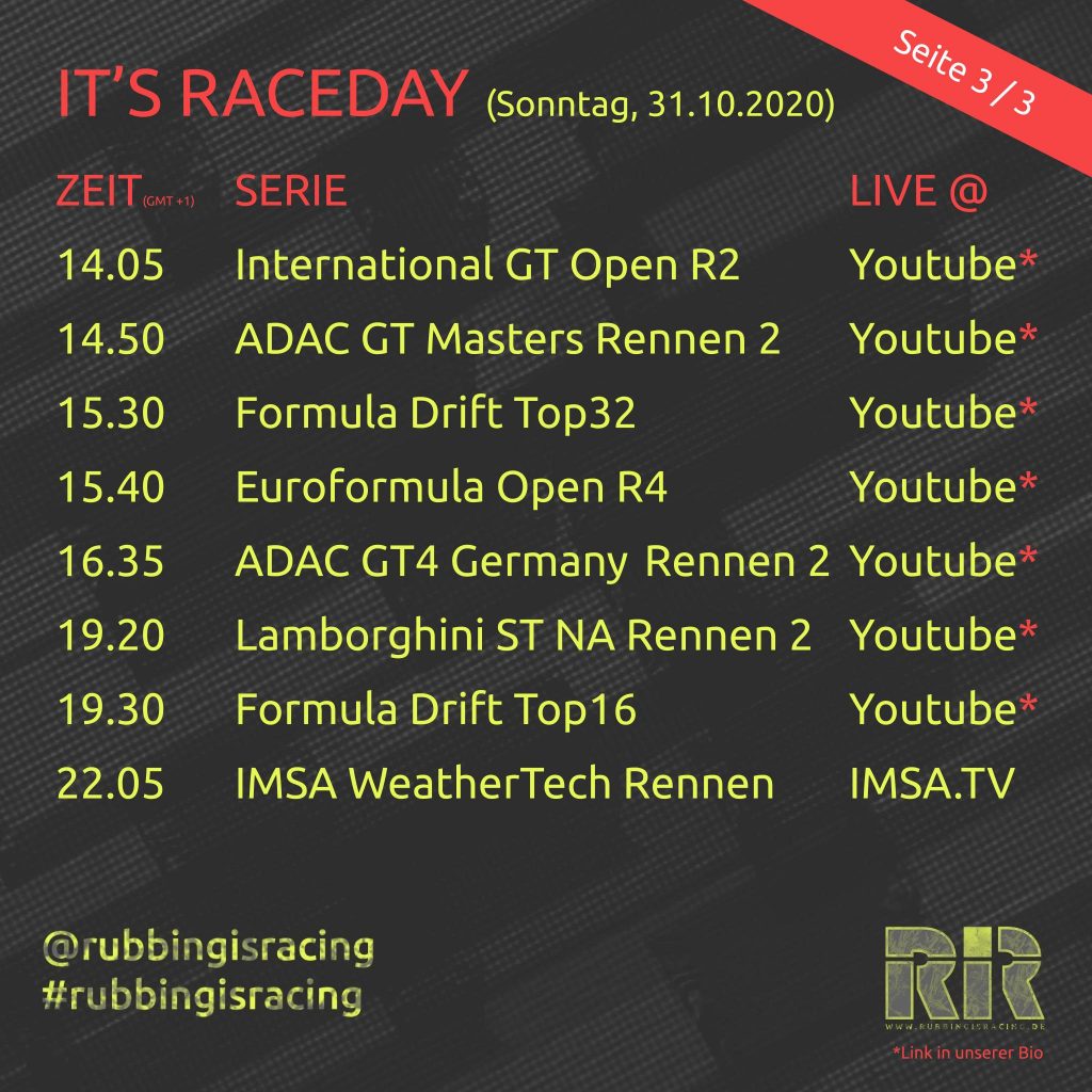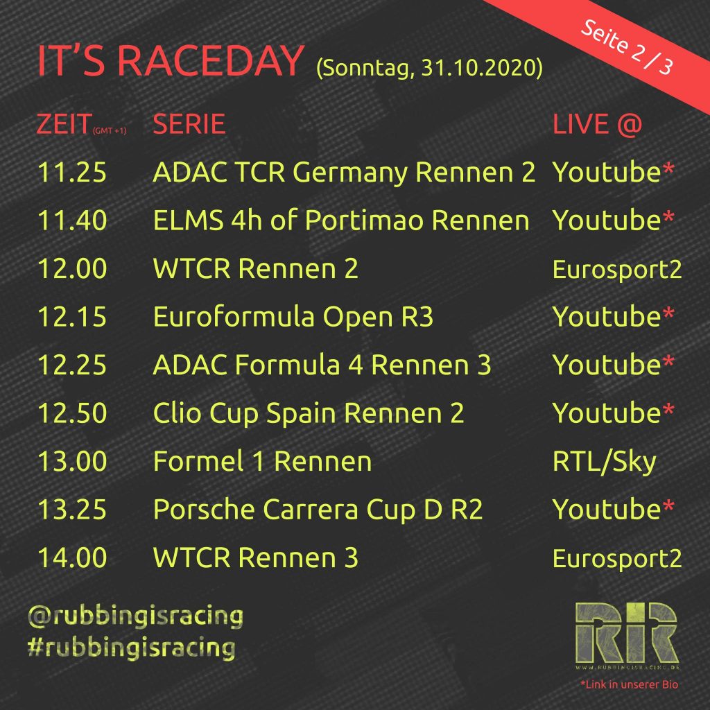 Sonntag, 01.11.2020 – IT’S RACEDAY #97! Die Formel 1 startet in Imola heute den GP der Emilia-Romagna. Zussätzlich gibt es die zweiten Rennen des ADAC GT Masters und des Porsche Carrera Cups Deutschland am Lausitzring sowie der International GT Open aus Barcelona. Die ELMS startet in Portimao in ihr 4h Rennen und die FIA WTCR wird im Motorland Aragon mit ihren drei Rennen ebenfalls für reichlich „wheel to wheel action“ sorgen. Am Abend gibt es dann mit der Formula Drift und der IMSA noch weiteren Rennaktion aus Amerika. Wie immer sind alle Livestreams kostenlos! Viel Spaß beim Streamen!