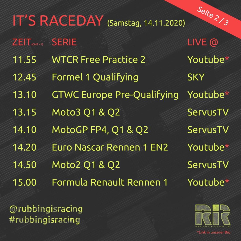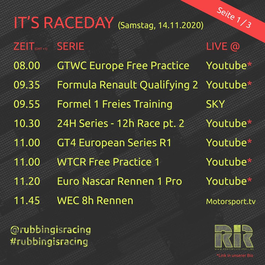 Samstag, 14.11.2020 – IT’S RACEDAY #100 Was für ein Wochenende für Fans von Endurance-Racing! nicht ein, nicht zwei, nicht drei sondern direkt vier Rennen stehen dieses Wochenende auf dem Plan. Hinzu kommt, dass es sich auch bei allen Rennen um das finale Rennen der Saison handelt – Spannung ist also garantiert! So freuen wir uns heute auf die 8h of Bahrain der WEC, die 12h of Sebring der IMSA sowie den zweiten Teil der 12h von Mugello der 24H Series, bevor morgen auch die GT World Challenge Europe in Paul Ricard in ihr finales Rennen startet. Da gehen die Formel 1 Rückkehr in der Türkei sowie die MotoGP an diesem Samstag fast etwas unter! Wie immer sind alle Livestreams kostenlos! Viel Spaß beim Streamen – IT’S Raceday #100!